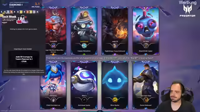 00:06:11Der Streamer beschreibt ein 'chilliges Game', das er ohne viele strategische Planungen beginnt. Er erwägt 'Saving Accounts', entscheidet sich aber dagegen. Er stellt die Frage, ob No Scout und No Pivot immer noch erlaubt sind. Er diskutiert über 'Request Rewards' und denkt, dass sie machbar sind. Er identifiziert 'Vanguard, Shepard, Arbitur, Darkstar' als wichtige Komponenten, kritisiert aber den 'Grausamen Start'. Er stellt fest, dass er auf Level 7 noch keine 6 Einheiten hat und dass das Emblem ihm nicht hilft. Er überlegt, ob er die Line Selection in 2-1 verbessern sollte, ist aber unsicher über die beste Strategie.
