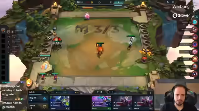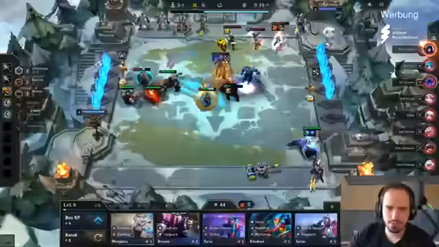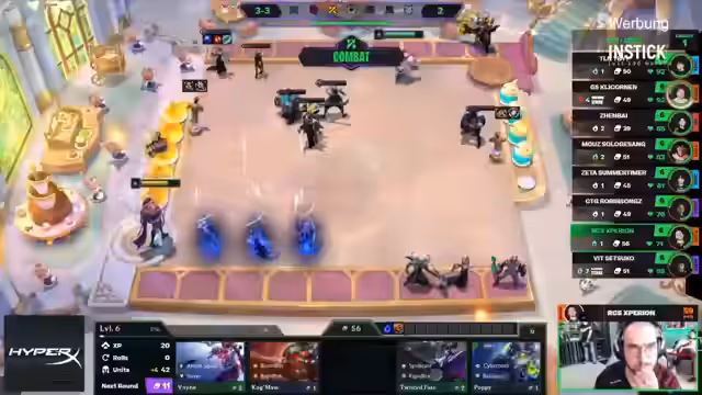 02:38:44Die Lobby wird vorgestellt, in der nur noch die Top 16 nach Runde 10 im Wettkampf verbleiben. Volta und Lloris stehen mit schlechten Plätzen (21 bzw. 23) unter enormem Druck und müssen stark performen, um auszuscheiden. Volta startet eine aggressive Double LeBlanc-Komposition, während Lyris den risikoreichen Cashout nutzt, um in die Startrunde 3-5 zu rollen und eine starke Komposition aufzubauen. Die Situation ist für alle vier Europäer extrem prekär.