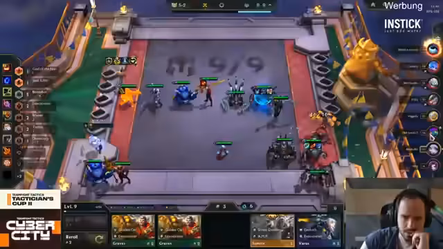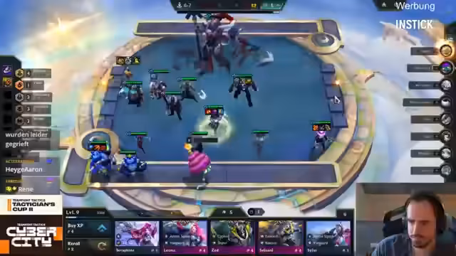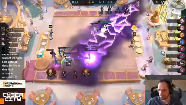 02:03:32Das deutsche Teilnehmerfeld in der Lobby wird analysiert. Löscher spielte stark mit einem zweiten und einem siebten Platz. Nilo wurde unglücklich platziert, obwohl er gut spielte, und Tomino hatte noch Potenzial, aufzukommen. Die Schwäche von TF im späten Spiel nach Level 7 wird angesprochen, da keine weiteren starken Champions mehr nachkommen und man auf Items angewiesen ist.