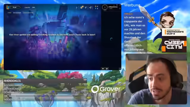 00:46:17Für das zweite Spiel wechselt die Lobby, erneut mit drei deutschen Spielern: Elia, WitchJangler und Doreto. Die Meta scheint sich zu verschieben, da Vayne nicht mehr als beliebt gilt. Es wird bereits eine mögliche Vayne/Jarvan-Comp erwähnt, auch wenn die Unit Vayne selbst als schwach eingestuft wird. Parallel wird die Partnerschaft mit 'Gruber' beworben, die Geräte-Miete und ein bevorstehendes Simracing-Event beworben.