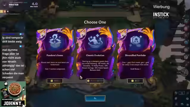 00:16:49Nach einem katastrophalen Kampf, bei dem sein GP schnell eliminiert wurde, überlegt der Streamer, ob er Gameless Blade Reforge nehmen oder weitermachen soll. Er ist mit reichlich Gold ausgestattet und plant, Pandoras Items am Ende zu reforgen. Er konstatiert, dass er trotz der Schwäche seiner Comp relativ viel Gold hat. Er entscheidet sich dafür, Ash zu spielen, da er infinite Level pushen kann. Mit Ash, Zyra und Synthra hat er eine neue Comp, bei der Dr. Mundo extrem tanky ist.