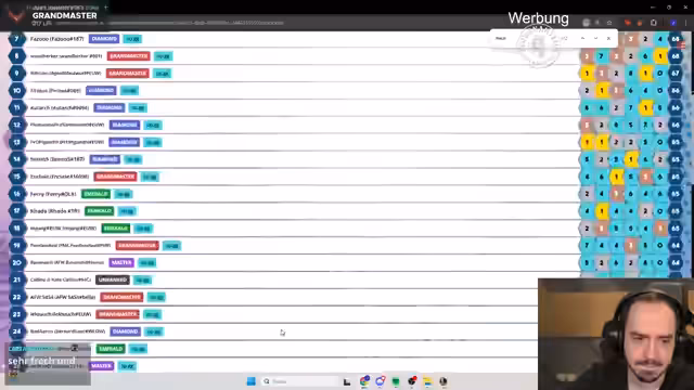 04:00:09Das letzte Spiel des Tages entscheidet über die Qualifikation für den Finaltag. Die Lobby füllt sich mit Spielern wie Franz (Bilgewater-Warden-Kombo) und Pinion (Noxus-Void-Experiment). Franz dominiert mit einer 20er Win-Streak und Tahm-Kench-Fokus, während andere Spieler um Platzierungen kämpfen. Besonders Bauernrichter scheidet früh aus, während Pinion mit verzweifelten Noxus-10-Versuchen um Punkte ringt.