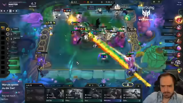 00:09:44Im späten Spiel ist der Fokus auf Level 9 gerichtet. Der Streamer ist reich an Gold und kann sich das leisten, aber er ist unsicher über die Board-Qualität. Die Champions Ryze 2 und Lysandra 2 sind sehr stark, aber kontrovers. Die Lobby hat bereits viele Ryze-Spieler, was den Hitt erschwert. Das Ziel ist, ein Level 9-Board zu finden, das consistent gewinnt, auch wenn es mit ungewöhnlichen Kombinationen wie Zoe statt Taric experimentiert wird.