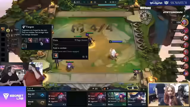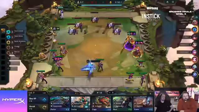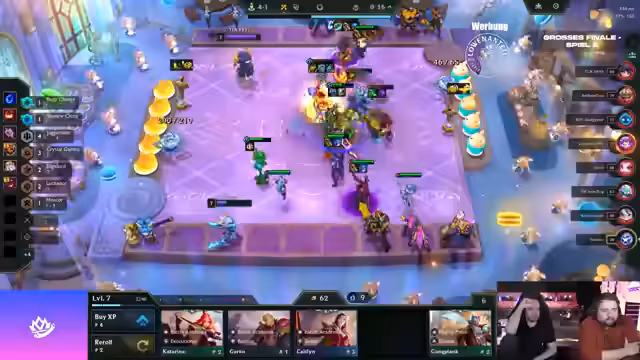 02:14:00Die strategischen Überlegungen von Tomino bezüglich der Juggernaut-Spatula sind entscheidend, da er eine Win-Streak benötigt und keine Kämpfe verlieren darf. Die Entscheidung, das Emblem auf Xing zu legen, bringt 20 Gold, aber die Juggernaut-Spatula bietet keinen sofortigen Crazy-Bonus, da bereits Juggernaut sechs aktiv ist. Die Möglichkeit, bis 5-1 zu warten, um Luchador zu treffen, wird in Betracht gezogen. Das gegnerische Board mit Zyra 2 und Crash 2 sowie Radiant Krakenslayer stellt eine große Bedrohung dar, aber Tomino hat ein sehr gutes Board für diese Phase des Spiels. Trotzdem haben andere Spieler einen deutlichen Goldvorteil, was die Situation für Tomino erschwert. Das Positioning gegen gefährliche Reroller wird als entscheidend angesehen. Das Treffen eines bestimmten Gegners wird als angenehm empfunden, obwohl die Upgrades fehlen. Die Pause im Spiel wird als unproblematisch angesehen. Die Überlegung, ein Juggernaut-Emblem zu machen und es Shen zu geben, wird als stark bewertet, da es weitere Optionen eröffnet. Edge-Dot mit Volibear 2 und Samira 2 wird als sehr gut eingeschätzt, obwohl die F-Sort-Items dafür benötigt werden, die oft knapp sind. Der persönliche Hintergrund von Tomino, einem Slowaken, der als Einzelkämpfer in die Weltspitze aufgestiegen ist, wird beleuchtet. Er war kein Favorit vor dem Turnier, hat sich aber durch seine starke Leistung in den Riesel-Finals und seine Integration in die Study Groups bewiesen. Sein Erfolg verändert nicht nur seine finanzielle Situation, sondern auch seine Position in der Community, da er nun als begehrter Partner für Study Groups gilt.