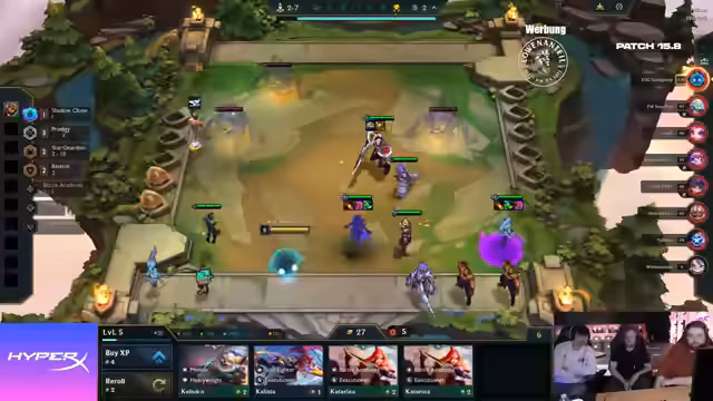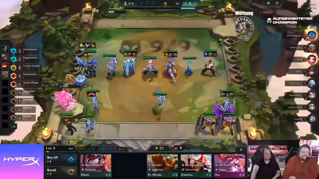 05:26:32Die Partie erreicht eine entscheidende Phase, in der Sang-Yob mit 143 Gold vor einem wichtigen Rolldown steht und möglicherweise auf Level 9 pusht, um einen Lissin zu treffen. Die Bedeutung von 'Minidious Monetization' wird hervorgehoben, die zusätzliche AP auf Level 7, 8 und 9 gewährt. Die Notwendigkeit, 'Noxus Trap' auf Twisted Fate zu treffen, um Amor Shred und Anti-Heal zu sichern, wird betont. Ein weiterer Spieler, Iron Bock, ist Level 9 mit nur 9 HP und befindet sich ebenfalls im Rolldown, was die Spannung erhöht. Tomino, der sich im Double Down befindet, gewinnt einen wichtigen Kampf und sichert sich eine 10er Winstreak mit Raiding Gold, was ihm einen erheblichen Vorteil verschafft. Die Diskussion dreht sich auch um die Möglichkeit, Gegner zu 'griefen', um deren Sieg zu verhindern, was in dieser späten Phase des Turniers eine gängige Strategie ist. Die Spieler müssen abwägen, ob sie auf maximale Risiko gehen oder versuchen, sicher Punkte zu sammeln.