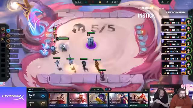 05:13:51Der Streamer diskutiert die strategische Ausrichtung des Spiels, insbesondere die Entscheidung, nicht sofort auf vier Bastion-Einheiten zu gehen, sondern stattdessen auf Xfire-Ad und vier Stargardien zu setzen, was durch eine starke Ray-2-Star-Einheit untermauert wird. Er analysiert die Item-Verteilungen der Gegner, wie Pandora's Items, Sunfire und Wolzdorf, die unerwartet erscheinen und Flexibilität in den Kompositionen ermöglichen. Besondere Aufmerksamkeit gilt den Spielern, die auf 'Checkmate' stehen, wie Luo-G und Without You. Es wird die Bedeutung von Gold-Druck und Winstreaks hervorgehoben, wobei Tomino eine 5er Winstreak mit 30 Gold erreicht, was als sehr vielversprechend für den Spielverlauf angesehen wird. Die Diskussion dreht sich auch um die Risiken und Belohnungen früher Investitionen und die Anpassungsfähigkeit an die Gegner-Boards.