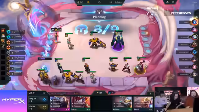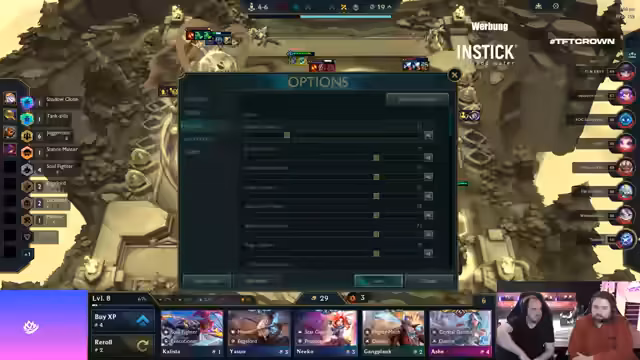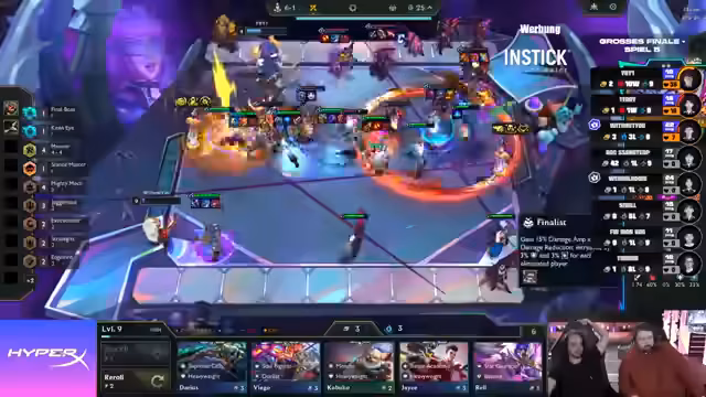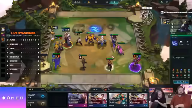 03:08:02Die Boards der Gegner werden analysiert: Jena Koboku mit acht Kobokus und sieben Jenners, Maisa mit Blue-Buff, Terry Sniper mit fünf zufälligen Emblemen, die gut gefittet wurden, und ein Lobby-Sieger mit 20 Rerolls auf Level 9. Tomino trifft auf Terrys Seraphine-Board, das durch die Sniper-Positionierung der Seraphine tricky ist, da sie von ihrer Auto-Attack-Range tanken kann. Es wird betont, dass die Carries nicht beieinander stehen sollten. Ironbog hat 16 Kills und könnte noch stark werden, obwohl ihm einige Fighting Augments fehlen. Tomino muss einen Kampf gewinnen, aber Darius wird fertig, und er steht schlecht. Trotzdem gewinnt er durch ein Edge of Night Pop des Volibear, was das Positionierungsproblem löst. Es wird Hoffnung auf eine Top-4-Platzierung geäußert. Crystal Gambit wird als wenig effektiv für Ironbog beschrieben, da er Pech mit den Cashouts hatte. Tomino entscheidet sich, nicht auf Level 9 zu gehen, sondern Poppy 2 zu suchen und Items zu wechseln, was überraschend ist. Er gewinnt einen Kampf gegen Koboku dank QSS und einem ausrastenden Voli. Die Damage-Chart zeigt, dass der Secondary-Carry 8000 Schaden macht. Tomino ändert sein Power-Up, da Tentake Smash nicht gut ist. Leona erhält ein Tank-Item, Nico randomisierte Items. Tomino verliert gegen ein starkes Crew-Board von Without You mit Twisted Fate und Malfoy 3, Shen 3, Jenna 3, was ihn auf den siebten Platz verweist. Er hat damit 17 Punkte und kann in dieser Runde nicht Weltmeister werden. Es wird gehofft, dass Luokyu schnell ausscheidet, um eine frühe Entscheidung zu verhindern.