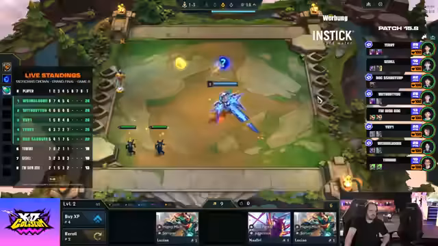 02:23:37In einer kritischen Runde muss Tomino strategische Entscheidungen treffen, um seine Position zu behaupten. Er überlegt, Shen statt Xin zu nutzen, was jedoch den Soulfighter 4-Bonus kosten würde, der für seinen Main-Carry und Main-Tank wichtig ist. Trotz einer schwächeren Runde gelingt es ihm, mit einem Volibear und zwei Radiant-Items hervorragend abzuschneiden. Ein besonders bemerkenswerter Kampf zeigt einen Dummy, der unerwartet viel Schaden absorbiert und Tomino einen wichtigen Sieg sichert. Dieser Kampf gegen Sangyab, der einen Kaiser mit 53 AD und Rise 2 einsetzt, ist entscheidend. Tomino erreicht einen Sechser-Winstreak und Level 9, was ihm die Möglichkeit gibt, Legendary Hits zu erzielen. Trotz einiger knapper Situationen und fehlender Items für Lee Sin, wie ein Sterax oder BT, schafft es Tomino, seine Winstreak fortzusetzen und sich den Top 4 zu nähern. Die Lobby ist extrem eng, und jeder Kampf zählt.