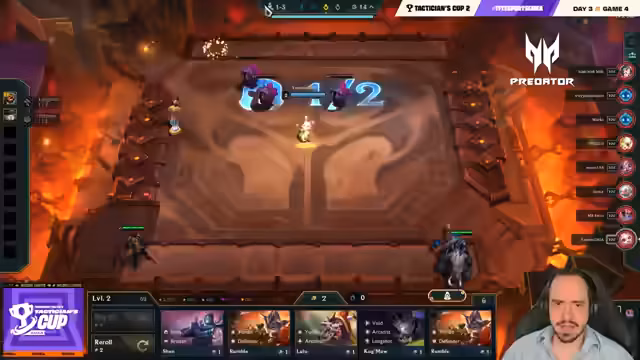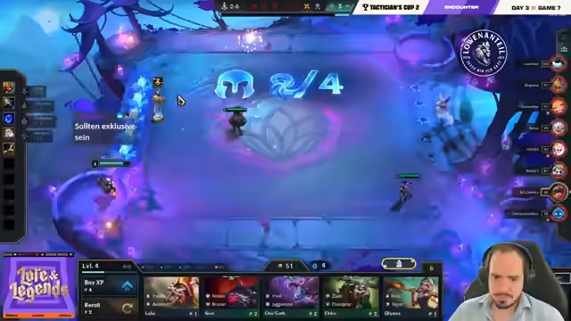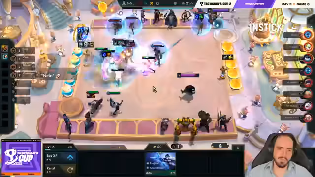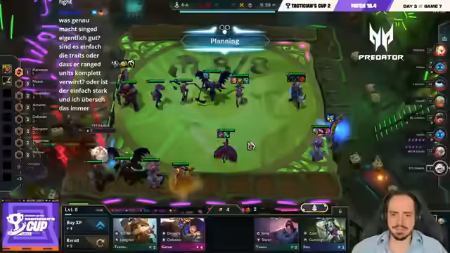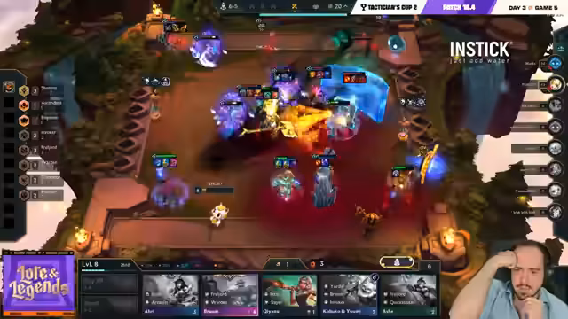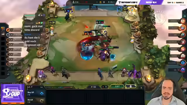 06:26:00Das Spiel eskaliert, als Spieler versuchen, auf Level 8 und Level 9 zu kommen. Lloyd baut stark auf seine Lissandra-Yuumi-Kombination auf, während Löscher über sein Invoker-Emblem auf Seraphine viel Schaden erzeugt. Narkes kämpft mit seinen Ressourcen und wird von mehreren Seiten bedrängt. Die Kämpfe sind extrem knapp und HP-technisch ein Nervenkitzel, der darüber entscheidt, wer in die Top 4 kommt.