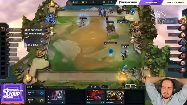03:10:54Der Stream beginnt mit der schockierenden Feststellung, dass Kanbais eine überragende Lobby gespielt hat und damit den ersten Platz sicher hat, ohne dass er Bonusgold erhalten hat. Harald wird für seine Investitionen von 18.000 AP gelobt. In der gleichen Lobby kämpfen Löscher und Nuri um die verbleibenden Plätze und führen ein deutsches Duell. Löscher startet mit einem sehr guten Board, während Nuri mit einer schlagkräftigen Kai eine Entscheidung gegen Lissandra herbeiführt und den fünften Platz sicher. Nuri festigt damit seine Position in der Spitzengruppe.