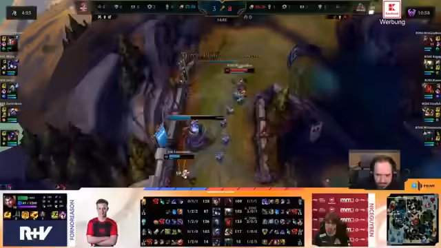 07:25:39Das Team erreicht eine sehr entspannte Ausgangslage mit zwei Drakes und einem Goldvorsprung auf dem Yone. Allerdings häufen sich in der Mid-Game-Phase strategische Fehler. So wird ein Teamfight am Baron-Nashor nicht genutzt, da die Gegner-Supporter unter die Türme flieht, anstatt zu sterben. Ein Missverständnis in der Teamkommunikation führt zu einem unkoordinierten Fight, der vom Gegner als Death Ball gewonnen wird. Zudem wird die Seitenlinie vernachlässigt, was es dem Gegner ermöglicht, durch Split-Puck Druck auszuüben und so in eine unangenehme Position zu geraten.