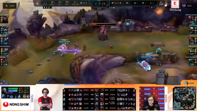 07:05:29Die Lane-Phase entwickelt sich für die Hangry Knights schwierig, besonders als Tanja wegen eines fehlenden Wave-Managements von Agorin ins Overstepping gerät. Das führt zu einem Verlust für Tanja und gleichzeitig zu einem kleinen Vorteil für Kaufland am Bot. Dung Dynasty fokussiert sich auf den ersten Drake und startet den Contest, während Kaufland über den Move von Random agiert. Random kann mit seinem hohen Schaden in einem Kampf First Blood für sich holen und demonstriert dabei seine Stärke.