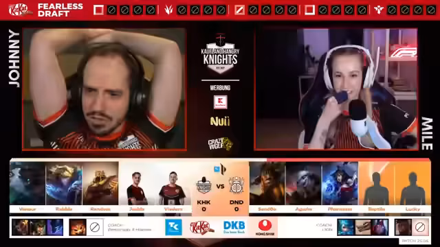 06:51:17Das zweite Spiel beginnt mit der Hoffnung auf einen Reverse Sweep. Die Hangry Knights haben die Side Selection. Der Kommentator analysiert den Draft und sieht in Tristana und Ari eine unerwartet starke Kombination mit viel Reset-Potenzial. Gleichzeitig wird das Problem des fehlenden klaren Engage-Tools erneut angesprochen, das auch im zweiten Spiel bestehen bleibt. Die Red Side wird als vorteilhaft angesehen, und der Rumble-Pick als starker erster Wumms für Dung Dynasty bewertet.
