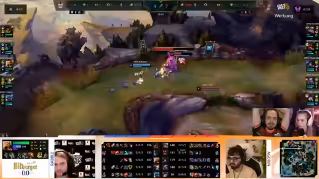07:19:28Im Mittelpunkt des Streams steht der Kampf um den ersten Drachen. Nach einem initialen Engagement, das vom Kommentator als hübsche Idee, aber nicht ganz optimal angesehen wird, setzt das Team auf ein besseres Setup um den Herald. Die Zusammenarbeit führt zu einem Second-Herald-Charge, was dem Team Midlane-Priorität verschafft, aber beide Teams gezwungen zurückzieht. Der Drache wird letztlich erfolgreich gesichert, was als positives Lern-Erlebnis gewertet wird, da das Team lernte, den Herald strategisch einzusetzen, ohne dabei unnötig zu sterben.