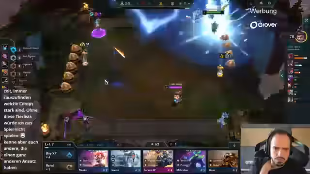 00:59:55Nach einer Runde, die im Top 4 endete, beginnt der Streamer einen neuen Versuch. Er entscheidet sich, den Plan, eine fröhliche Party mit Gwen und Xayah zu spielen, zu verwerfen und stattdessen einen Juggernaut-Trade mit Darius zu spielen. Er erhält den Prismatic Trade, der ihm nach 10 Siegen einen permanenten Schadensbonus verspricht. Der Streamer rollt aktiv, um die nötigen Units wie Darius und Juggernauts zu finden und entscheidet sich, auf Level 8 zu bleiben, um Gold zu sparen, bevor er auf Level 10 aufsteigt, um die Einheiten mit Gold einzukaufen. Sein Team mit Darius und Gangplank zeigt Potenzial, ist aber noch nicht stabil.