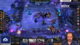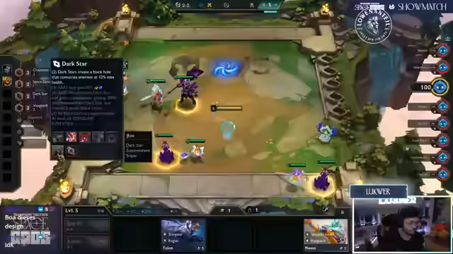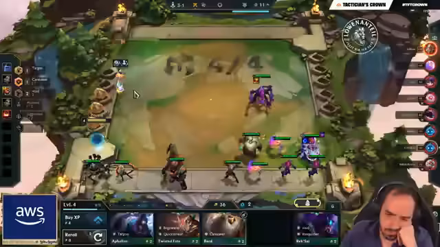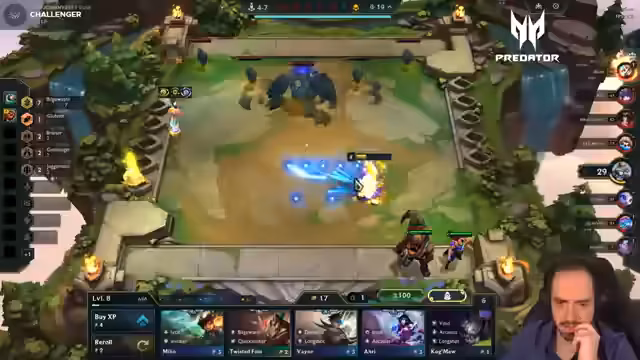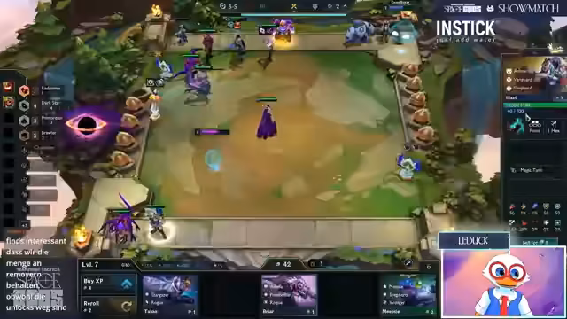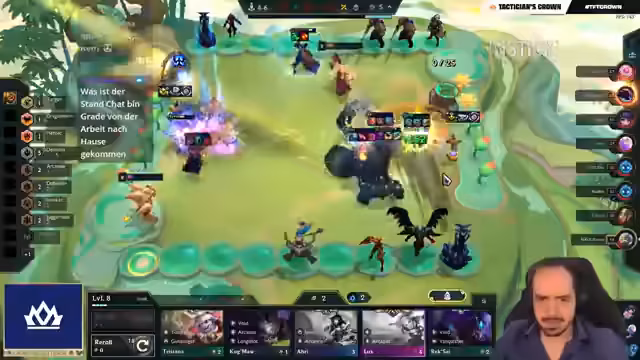 03:18:45Die Spieler erreichen die Endphase des Sets, der Fokus liegt auf dem Erreichen von Level 9. Revan hat bereits die LeBlanc zusammengekriegt, was ihm neue Möglichkeiten eröffnet. Die Item-Strategien werden weiter verfeinert, wobei void staff und Morello erwähnt werden. Ein Fight entscheidet über den Verbleib im Turnier, bei dem der Scylis beinahe die Lissandra tötet, aber am Ende Revan ausscheidet.