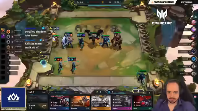 03:14:14Die Konkurrenz intensiviert sich, besonders im Duell zwischen Revan und Elia. Revan spielt eine Open-Fort-Variante mit Patience is a Virtue und stabilisiert sich auf einem Demacia-Board. Nach einem schlecht verlaufenen Kampf verliert Elia seine Streak und fällt auf Platz 5. Elia kritisiert sein Item-Build und wäre stattdessen lieber auf Giant Slayer gewesen.