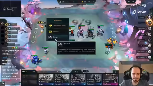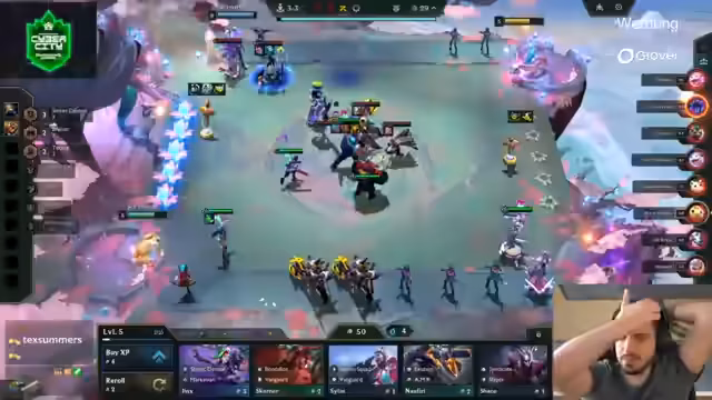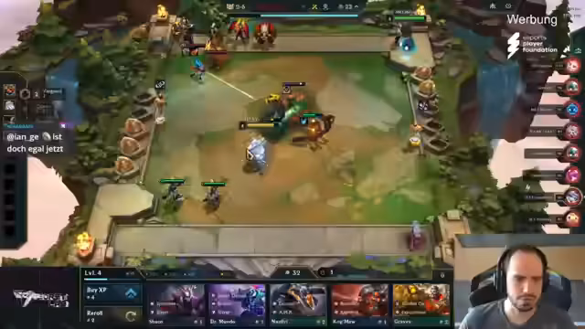 00:33:56Der Stand der Spieler wird live verfolgt. Volta gerät in Schwierigkeiten, nachdem er sich gegen die Chancen für ein 10-Street-Demon-Board entschieden hat und lebt nun nur noch mit 33 HP. Seine Forward Thinking Augments helfen ihm dabei, die Gold- und XP-Breakpoints zu halten. Coco baut ein gefährliches Exotec-Board mit vielen Giant Spades auf, während Womandev überraschend Bronze for Life als Augment erhält. Tech Summers versucht in Richtung Boom-Bot zu pivotieren, hat aber mit seiner Economy zu kämpfen.