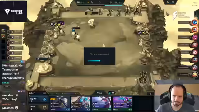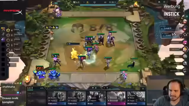 04:32:45Die Twisted Fate-Komposition, die als unfair und stark galt, erleidet einen dramatischen Niedergang. Der Spieler, der sie spielte, verliert einen Fight gegen den Letztplatzierten der Lobby. Obwohl er später seine Einheiten wieder zusammenbekommt und mit Draven 3 und Galio 3 eine solide Basis hat, kann er seine Einheiten nicht hochleveln und wird von YVY's starkem Board aus dem Rennen geworfen. Die Komposition wird als mental herausfordernd beschrieben, da man vom Letztplatzierten hart contested wird und es lange dauert, sich davon zu erholen. YVY selbst sichert sich mit einem angepassten Board den Sieg.