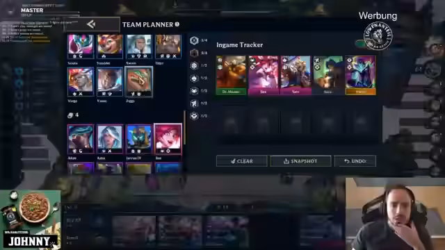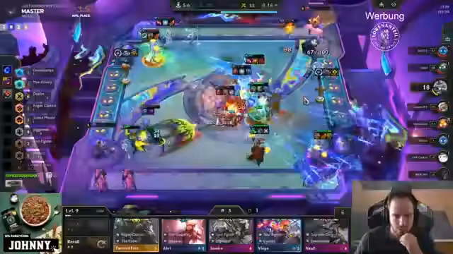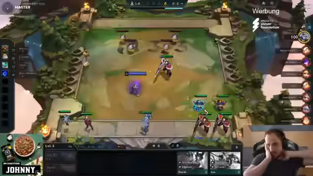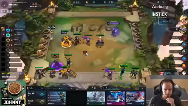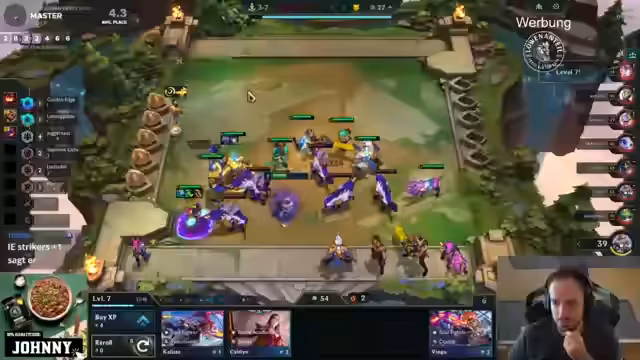 00:03:10Der Stream beginnt mit technischen Geräuschen an der Cam, die sich aber in Ordnung befindet. Der Streamer begrüßt die Zuschauer und stellt fest, dass er eine gute Serie von Top-4-Platzierungen hat. Der Fokus liegt auf dem Lobbymanger, bei dem er über die optimale Haltung von Einheiten nachdenkt. Sein Plan ist, Garen zu halten, um eventuell das Garen-Hero-Augment zu bekommen, was sehr stark wäre. Die Lobby scheint komplex, mit vielen AP-orientierten Einheiten wie Swain und Jhin, und er muss eine Entscheidung über seine Line treffen, ob er auf AD oder AP setzen soll.