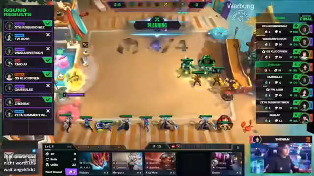02:18:42Das WM-Finale beginnt mit acht verbleibenden Spielern, darunter dem Europäer Klikornen, der zu den Favoriten zählt. Er hat die Chance nach dieser Runde auf 20 Punkte zu kommen. Streamer Robson spielt mit Urgott-Units und hat ordentliche HP, während andere Spieler wie Solos bereits ausgeschieden sind. Die besondere Aufmerksamkeit gilt Klikornen als dem verbliebenen Europäer in diesem Finale.