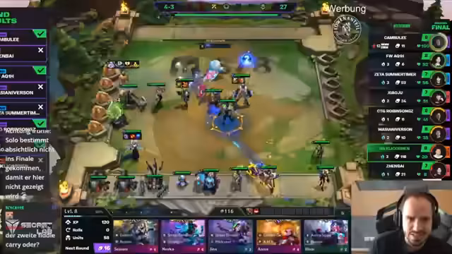02:20:16Im Verlauf des Streams werden verschiedene Boards und Spielerstrategien beleuchtet. Spieler Vajon zeigt ein starkes Board mit Sniper-Fokus, während Klikornen seine Einheiten schrittweise verbessert. Es kommt zu spannenden Kämpfen, bei denen die Entscheidung über Sieg oder Niederlage oft von kleinen Vorteilen abhängt. Die Leistung einzelner Units wie Garen oder LeBlanc wird besonders hervorgehoben.