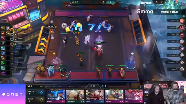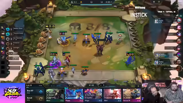 01:28:35Ein Spieler landet auf dem sechsten Platz, da seine Star Guardian-Strategie mit Radiant Spear an den Legendary Bots scheiterte. Im Karussell sind verschiedene Boards zu sehen: ein Bastion-Board mit Seraphine 2-Star und Twisted Fate, ein sehr starkes Mage-Board, ein Luchador-Juggernaut-4-Setup mit Luchador-Emblem auf Sinn (was unglaublich viel AD gibt), und Wingman in der Prodigy-5-Academy-5-Variante. Auf Level 9 wird normalerweise Zyra hinzugefügt, um einen Spike zu erzielen, kann aber nicht mit dem Rest konkurrieren. Das Jenna Koboku Board auf Level 8 mit Kassante wird ebenfalls überholt. D.Hua spielt die 2-Cost-Rearline, die Lobbys gewinnen kann, besonders mit 'Evil Beyond Measures'. Der Braum eines Spielers ist beeindruckend positioniert und wirft Cutter auf Seraphine, um sie zu töten. Bluebuff, Protectors und Mana Seraphine sind exzellente Items. Der Spieler mit Living Forge erhält in 6.1 ein weiteres Artefakt. Double, der europäische Vertreter aus Frankreich, spielt von Anfang an extrem gut, setzt auf Full-Win-Streak und committet sich früh zu Star Guardian, um Power zu haben und später auf Level 9 mit Seraphine zu zocken. Er ist bereits in den Top-2 angekommen.