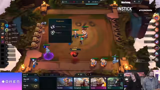 03:04:40Die Spielstrategie von Wettjungler wird detailliert analysiert. Er setzt auf 'Spirit Link' in Kombination mit 'Heavyweight'-Einheiten, die von der zusätzlichen HP-Regeneration besonders profitieren. Die Zuschauer werden ermutigt, Fragen zu den Boards zu stellen, und es wird ein Spagat zwischen Anfängerfreundlichkeit und tiefgehenden Informationen angestrebt. Das Karussell wird genutzt, um die Boards zu präsentieren und einen Überblick über die Entwicklungen zu geben. Die nächste Augment-Auswahl bietet interessante Optionen, darunter 'Branching Out' und 'Pandora's Bench', letzteres auch bekannt als 'French Bench' in der europäischen Szene. Wettjungler entscheidet sich für 'Pandora's Bench', um seine Einheiten zu optimieren. Dies führt zu erfolgreichen Shen-Upgrades und einer stabilen Frontline, die ihm hilft, die frühen Phasen des Spiels zu überstehen. Obwohl er keine beeindruckende Siegesserie erzielt, ist er mit seiner Ausgangssituation zufrieden. Die Strategie, auf 'Bastions' und später auf 'Legendaries' wie Seraphine zu setzen, wird diskutiert. Andere Spieler verfolgen unterschiedliche Kompositionen: Dysic spielt vier Bastions mit Ari als Carry, während Tomino auf Koboku Jenna Reroll mit 'Treasure Hunter' setzt. Casey Double spielt Gnar Mundo und bereitet sich auf Varus vor. Die Herausforderung für Wettjungler besteht darin, trotz fehlender Upgrades und einer drohenden Niederlagenserie Zinsen zu sammeln und ein starkes Board aufzubauen. Er verliert einen Kampf knapp, was seine Position weiter schwächt. Die Auswahl von DuQ bringt ihm jedoch Twisted Fate und Braum, was seine Optionen erweitert. Die Entscheidung, auf Twisted Fate zu setzen und eine sechste Bastion hinzuzufügen, wird als überraschend, aber potenziell effektiv bewertet. Der Fokus liegt nun darauf, Leona zu finden und die Frontline weiter zu stärken, um den Druck der Gegner standzuhalten.