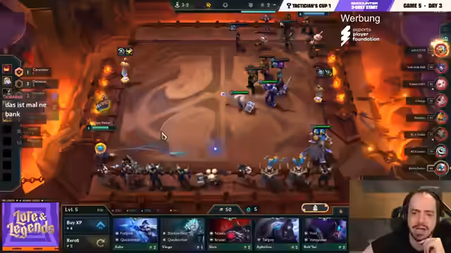 03:53:10Die Kommentatoren konstatieren, dass die meisten deutschsprachigen Vertreter aktuell auf den unteren Plätzen stehen, was eine angespannte Situation darstellt. Kevin Parker hat die beste Ausgangslage, hat aber Schwierigkeiten, seinen Yasuo 3 zu vollenden. Yamato, der stark begonnen hat, verliert Fights und sieht sich mit einem leeren Goldstand und-Level 6 konfrontiert. Die Kommentare sind voller Superlative für die gezeigten Leistungen, insbesondere für Skipeos, der mit einem unbesiegbaren Taric eine Masterclass abliefert. Die nächste Runde verspricht weiterhin Spannung, da nur noch wenige Spiele bis zum Ausscheiden mehrerer Spieler verbleiben.