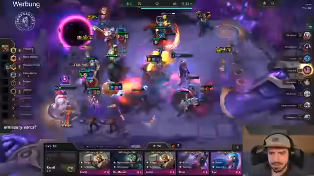 01:51:56Es wird über drei Spieler mit Family Emblem gesprochen und Rick Chop, Nettle Mitch erwähnt. Die Strategie, Loris Blitzcrank Twisted Fate zu rollen, wird als ansprechend empfunden. Es wird Löschers Entscheidung, auf Level 6 zu bleiben, analysiert, um die Series restunnen zu wollen, was jedoch das Risiko birgt, die Streak zu verlieren. Coco wird als jemand beschrieben, der Level 7 gegangen ist und jetzt 6 Scrap hat. Er erhält die Zweier-Powder und upgraded Champions. Seine beiden Belts werden zu Guardbreakern auf Gangplank und Corki. Er hat noch drei Komponenten übrig und könnte ein Last Whisper anstreben. Löscher hat eine 10er-Winstreak und geht auf Level 7. Es wird die Sorge geäußert, dass er keine weiteren Series getroffen hat. Er hält von der Line nicht viel und könnte im Zweifel auch Twitch spielen. Er entscheidet sich für Double Rage Blade statt Infinity Edge, was als ungewöhnlich angesehen wird. Ihm scheint Level 7 wichtiger zu sein, um die 6 Watcher spielen zu können. Er nimmt Call to Chaos und rollt nicht einmal, was als schlechtes Vorbild dargestellt wird. Coco bekommt Call to Chaos und reforged seine Items.