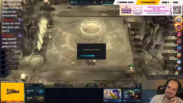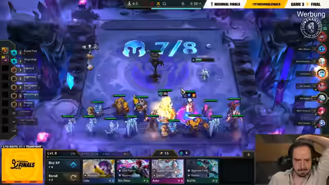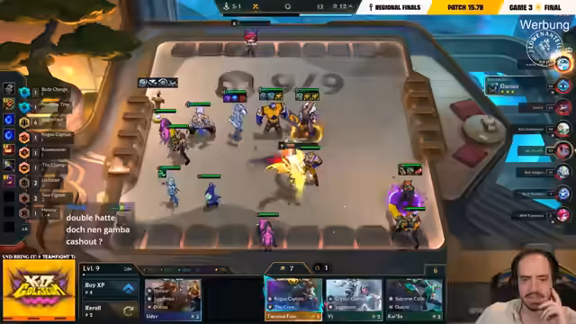 01:29:12WetJungler kann im späteren Spielverlauf ein Double Strike-Item für seinen Shen sichern, was seine Board deutlich stärkt. Allerdings ist er zu spät mit dem Upgrade und erreicht erst in Runde 5-1 Level 7. In dieser Phase gewinnt er zwar wichtige Fights gegen schwächere Gegner, kann aber den Rückstand auf die Top-Spieler Coco und Travis nicht mehr aufholen. Das Spiel endet für WetJungler mit einem hinteren Platz, was eine durchwachsene Leistung im Finale darstellt.