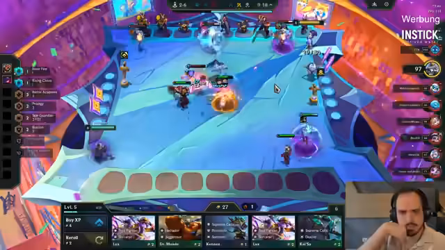 04:05:25Der Stream startet mit einer Runde im Teamfight Tactics. Der Spieler entscheidet sich für eine Windstrick-Kombination, die viele Two-Cost-Reroader und vier Juggernauts enthält. Bei der Wahl zwischen Morelos auf der Kaiserin oder einem Levelpush entscheidet er sich für den Levelpush, was zu Goldverlust führt. Die Runde wird als schwierig beschrieben, und der Spieler erkennt Fehler in der Entscheidungsfindung, da er fälschlicherweise annahm, dass Shen die Runde stabilisieren würde. Schließlich gewinnt die Runde, obwohl sie als kompliziert und "Murks" eingestuft wurde.