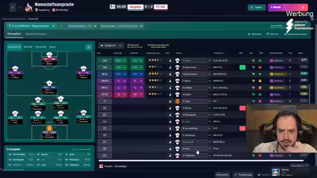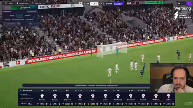06:18:30Der Streamer bereitet sich auf den nächsten Spieltag gegen Hoffenheim vor. Aufgrund von Verletzungen im Kader, wie bei Timon und Ragnache, muss er taktische Anpassungen vornehmen. Er versucht eine offensive Taktik mit einer Dreierkette, was als nicht optimal beschrieben wird. Das Spiel verläuft holprig, und es gibt technische und taktische Unstimmigkeiten auf dem Bildschirm, die den Streamer frustrieren.