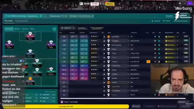 00:52:00Nach dem TFT-Part wechselt der Stream zum Football-Manager-Spiel gegen den Tabellenzweiten Stuttgart. Es wird ein umkämpftes Spiel beschrieben, in dem der 1. FC Köln defensiv stark agiert und ein Unentschieden erzielt. Der Streamer erwähnt den Transfer von Fabian Rze und die vielen Verletzungen im Kader, die das Spielplan erschweren. Das Spiel endet unentschieden, was als wichtiger Punktgewert gegen einen starken Gegner gewertet wird.
