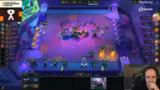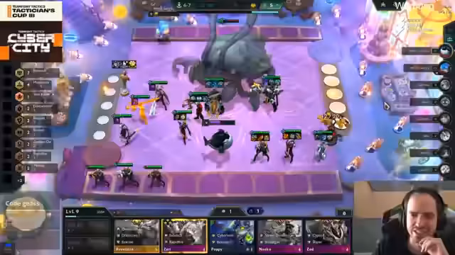 01:05:08Blizz nutzt seinen Shop-Glitch, um ein starkes Bot mit Senna 3 und Shaco 3 aufzubauen, während Löscher mit einer Anima-Squad-Line gegen Brand kämpft. Kubikson hat Schwierigkeiten, seine Rerolls effizient zu nutzen und verliert Gold, da er keine Legendaries trifft.