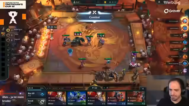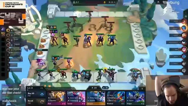 00:10:54Die erste Runde startet mit einer sehr breiten Patchmeta, in der rund 10 unterschiedliche Kompositionen spielbar sind. Löscher entscheidet sich für 'Unexpected Unexpectness' und wechselt dann zu 'Flexible', was ihm ein Marksman-Emblem bringt. Salvi wählt 'Lucky Gloves', was ihm eine zusätzliche Komponente im Karussell ermöglicht. Blizz entscheidet sich für 'Pumping Up' und scheint auf eine Loose-Streak-Komposition hinzuarbeiten. Kubikson zeigt bereits mit 'Hedgefund' einen sehr starken Start auf.
