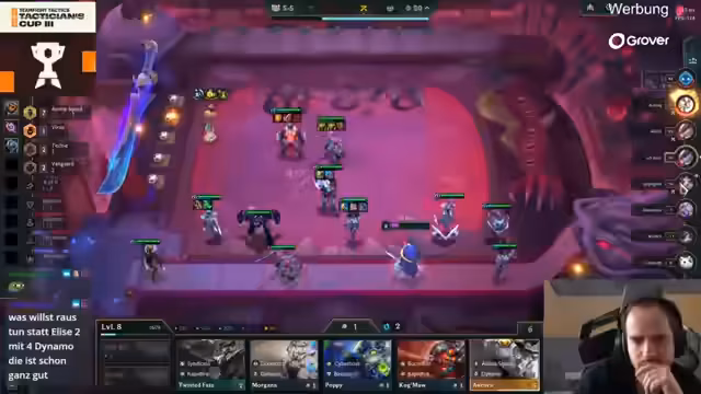 01:49:12Beide deutschen Spieler starten solide mit zwei Plätzen im Mittelfeld, was darauf hindeutet, dass sie in der aktuellen Meta bestehen können. Sodo Gesang wählt eine Kog'Maw-Vanguard-Kombination, die jedoch stark kontested ist. Exo favorisiert eine Morgana-Linie. Beide sind exzellente Solo-Q-Spieler, was ihren Erfolg hier stützt. Sodo versucht, sein Opening trotz des Kontests mit Hilfe von Pandoras Items zu halten, während Exo flexibel reagiert und seine Items für andere Linien vorbereitet.