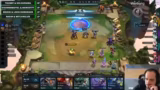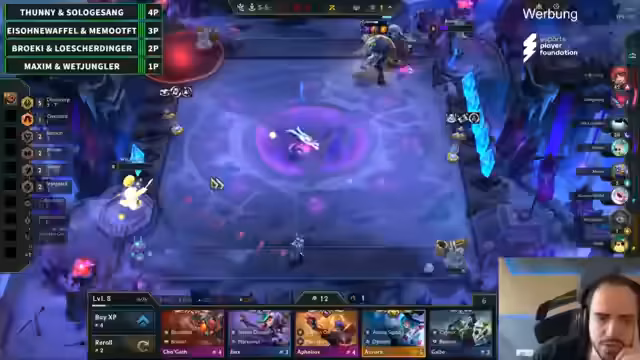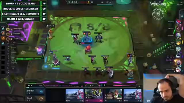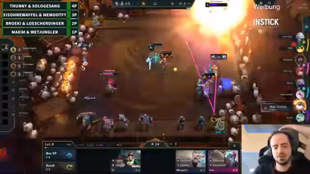 00:24:11Das erste Spiel beginnt und die Teams entwickeln ihre Taktiken. Während das Team Eis/Memo schnell eine starke Vayne 3-Kombi aufbaut und Items über das Double-Up-System teilt, kämpfen andere Teams mit früheren Niederlagen. WetJungler zeigt eine beeindruckende Cypher-Spieldynamik, während Löscher und Bröki eine Re-Roll-Kombo mit Nitro-Champions spielen. Solo und Tuni scheitern früh, während Eis/Memo durch die MF3-Kombo klar als Sieger hervorgehen.