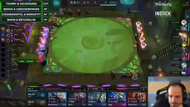 01:08:45Ein ständiges Rauschen und ein veränderter Sound stören den Stream, wobei die Quelle unklar bleibt, möglicherweise ein hochgefahrener Standing-Desk. Parallel dazu zeigt sich im Spiel eine ungewöhnliche Meta, bei der eine signifikante Anzahl von Spielern die 'BiddeBud'-Synergie nutzt. Diese Strategie, bei der Influencern als Profis gespielt werden, wird als sehr safe bewertet. In einem anderen Spiel wird eine ungewöhnliche Brand-3-Strategie anstelle von Annie-3 als sehr stark gelobt, da sie den Win früher erkennen und umsetzen.