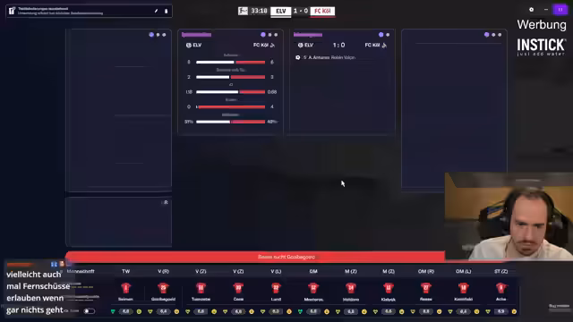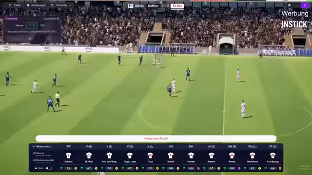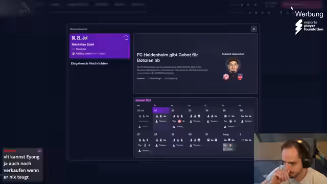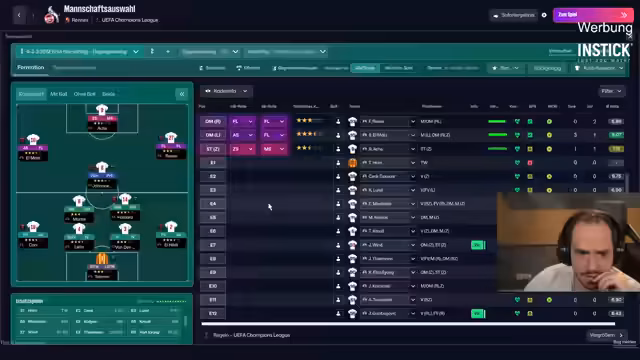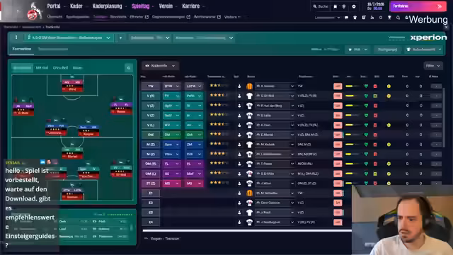 07:02:47Der Stream wechselt zu einer Live-Simulation von Testspielen während der Länderspielpause. Es werden die Aufstellungen und taktischen Entscheidungen erörtert. Spieler wie Johannesson und Thielmann werden als Schlüsselspieler bezeichnet, deren Leistung entscheidend ist. Es werden Probleme im defensiven Verhalten von Reze identifiziert. Der Streamer gibt Einblicke in die individuelle Trainingsplanung und testet alternative Aufstellungen, um die optimale Formation für die anstehenden Ligaspiele zu finden. Auch die Verletzungen im Kader werden als große Herausforderung für die restliche Saison beschrieben.