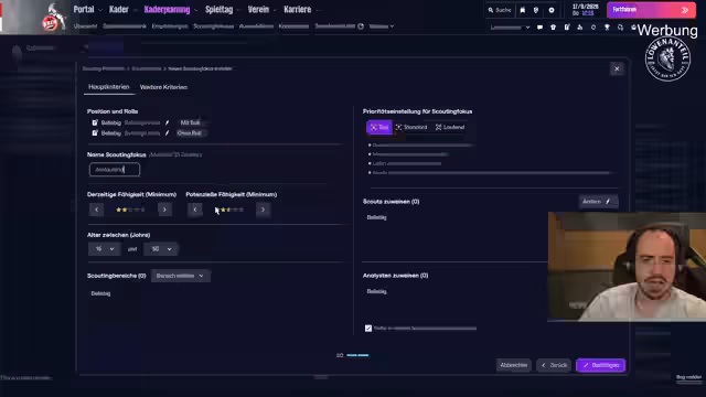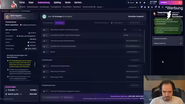 01:46:04Die Überlegungen drehen sich um den potentiellen Transfer von Spieler Touré, für den möglicherweise Interesse von Werner besteht. Der Streamer diskutiert die hohen Ausstiegsklauseln im Bereich von 75 bis 90 Millionen und denkt über den Kauf eines Spielers für späteren Verleih nach. Gleichzeitig wird das Scouting intensiv betrieben, wobei Fingenten für die U19-EM nominiert wurde. Eigengewächse wie Pamela stehen im Fokus, und der Flair-Faktor bei Neuzugängen wird kritisch bewertet.
