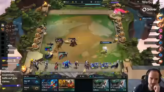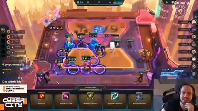 01:42:33Das Spiel startet mit einer starken Lobby, die bekannte Spieler wie Opal, Solo, Kessman und Elia umfasst. Die Performance der beiden deutschen Vertreter Nuri und Elia wird besonders beobachtet. Elia, der sich manchmal als "Caster-Cursed" fühlt, spielt ein Tempo-basiertes Board mit einer Morgana, während Nuri mit einem Jax-2 startet und sich auf Yuumi konzentriert. Der Streamer analysiert, dass Elia eine starke Eröffnung hingelegt hat und Nuri einen krassen Run hat, der auf das aktuelle Set zugeschnitten zu sein scheint. Entscheidungen über Items wie Thornplated Armor werden diskutiert.