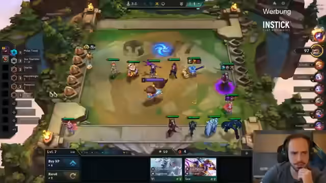 02:31:35Der Streamer passt seinen Spielplan an, indem er Lucian durch Gangplank ersetzt, da er eine bessere Einheit für die aktuelle Situation darstellt. Es wird eine Anti-Synergie zwischen Tiny Terror und Edge of Night identifiziert, da der Aggro-Drop von Edge of Night nicht viel Nutzen aus Tiny Terror zieht. Die Item- und Power-Up-Verteilung wird kritisch hinterfragt, um die Board-Synergien zu optimieren und Fehlgriffe wie den Einsatz von Senna zu vermeiden.