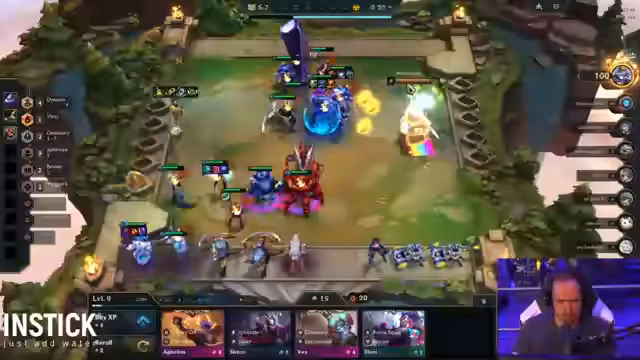 00:12:30Während des TFT-Spiels erklärt der Streamer seine Strategie. Er analysiert das Meta-Spiel und seine Augments, insbesondere die Stärke von 'Cloning Facility' bei einem starken Early-Board. Er spricht über die Notwendigkeit von Zinsen-Gold in NPC-Runden und die Bedeutung von Loose-Streaks. Das Spiel verläuft holprig, er verliert Units und wird in eine schwierige Position gedrängt, die er jedoch mit einem 'Koboku' Legendary und 'Poppy' wieder stabilisieren kann, um das Board zu stärken.