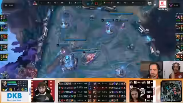 06:43:45Das beginnt als absolutes Fest der Action und des hohen Tempos. Die ersten Teamfights sind intensiv, mit First Blood auf beiden Seiten. Der Fokus liegt auf den Kills, dem Map-Controll und den Goldvorteilen. Die Spieler führen wilde Duelle aus, wobei die Positionierung und der Druck über die Map im Mittelpunkt stehen. Das Spiel entwickelt sich zu einem kranken Duell, bei dem beide Teams aggressiv vorgehen und sich nichts schenken.
