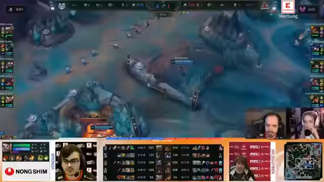 03:14:53Kaufland hat nun einen signifikanten Goldvorsprung und beginnt mit dem Baron-Nashor push. Ein entscheidender Fight entsteht, in dem Rossmann einen kritischen Fehler begeht. Nice Guy Ben nutzt sein Ability auf falsche Weise, was sein Todesurteil bedeutet. Kaufland nutzt diese Situation für ein perfektes Teamfight-Setup und gewinnt den Fight. Man ist dem 'Clean Ace' sehr nahe und kann den Nexus stürmen, was den Sieg im ersten Spiel sichert.