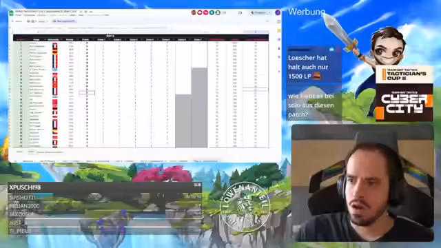 04:13:19Die Analyse konzentriert sich besonders auf Solo-Gesang, der nur einen Punkt auf den Cut hat und somit zwingend eine Platzierung unter den Top 4 benötigt. Der Streamer arbeitet mit einem Experten namens Löscher zusammen, der insights zum Spielverhalten der Gegner gibt. Es wird über mögliche Antipathien innerhalb der deutschen Szene spekuliert, während Solo ein riskantes Spiel mit Morgana als Hauptcarry wählt. Bei Itemdrops scheint es Ungereimtheiten zu geben, da Solo keine Gold-Drops erhält, während andere Spieler davon profitieren.
