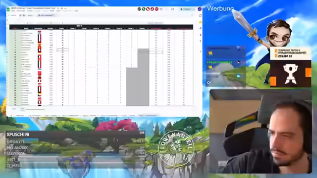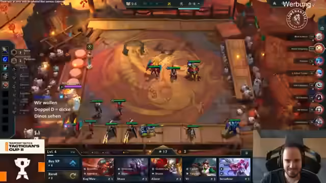 04:12:22Der Stream berichtet über die aktuellen Entwicklungen in der TFT EM Qualifikation. Es wurde von mehreren deutschen Spielern Abschied genommen: Doreto knapp am Cut gescheitert, Nuri mit Platz 20, El Salvi mit Platz 70 und Coinit mit einem achten Platz. Solo-Gesang und Exo sind die verbleibenden deutschen Vertreter, die beide auf Platz 3 und 4 liegen. Kubik-Sor führt mit 36 Punkten, während Solo und Exo nur einen bzw. zwei Punkte Rückstand haben. In anderen Lobbys gibt es enge Duelle und interessante Spielverläufe.