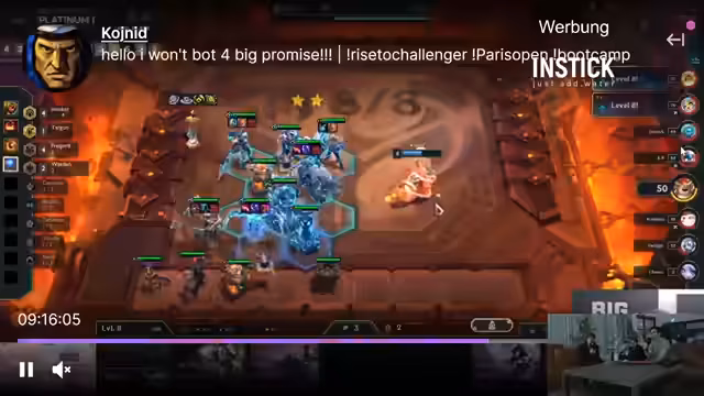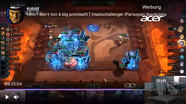 03:13:17Der Stream beginnt mit dem Gameplay des täglichen Grinds im Ladder-Race. Der Fokus liegt auf der Suche nach einer starken Platzierung in der Runde. Der Streamer analysiert die Synergien seiner gewählten Units und Items, wobei er sich bei einer Anivia-Gegenüberstellung nicht sicher ist, ob es sich um eine echte Synergie handelt oder nur um einen zufälligen Bonus. Trotz einer eher durchwachsenen Startphase und einem Verlust der Winstreak nach einem kurzen Erfolg gelingt es ihm, sich zu stabilisieren und eine Top-4-Platzierung zu erreichen, indem er eine strategische Entscheidung trifft und sein Setup weiter optimiert.