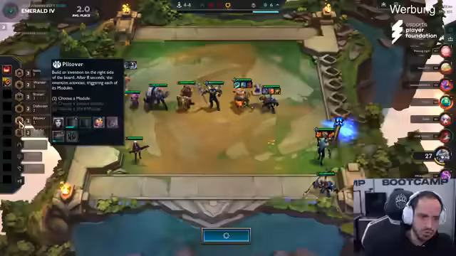01:21:40Nach einem Sieg erreicht der Streamer den Rang Emerald. Dies wird als ein bedeutender Meilenstein im Bootcamp gefeiert. Die Turnier- und Bracket-Anzeige wird gezeigt: Er ist im Advanced Bracket auf Platz 8 und könnte somit auch wertvolle LP gewinnen. Die Lobby des aktuellen Spiels wird als 'gottlos beschissen' beschrieben, da die Start-Units und Augmente sehr ungewöhnlich sind und kein klares Spielplan erlauben.